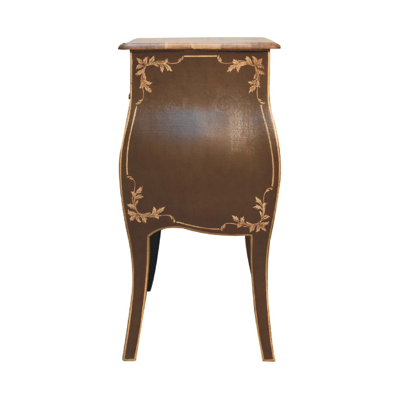 Discover elegance with the Coroner Collection Chest, a French-style masterpiece in a unique greyish-green finish with a natural top and inside the drawers. Made from solid mango wood, this bedside table features a hand-painted, sketched crown crest design, adding a royal touch to your bedroom. The design is complemented by sophisticated Chantilly legs and shiny brass knobs, blending functionality with luxury. Ideal for those who cherish a blend of elegance, durability, and historical charm in their home decor, this piece is destined to become a family heirloom.